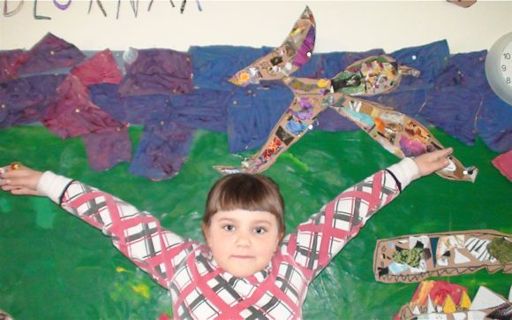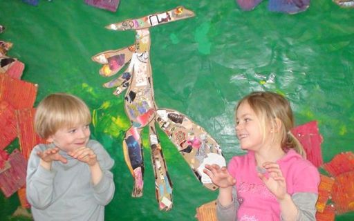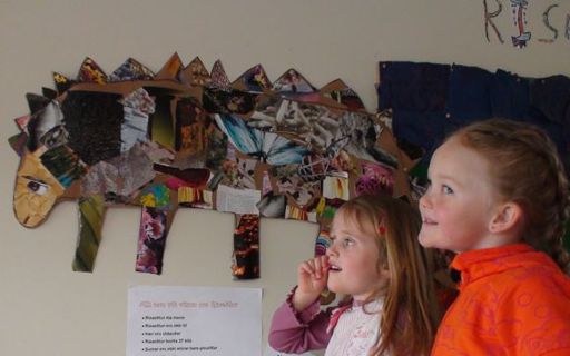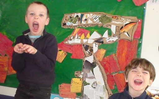 6 ára börn á Sjávarhóli eru hér að leika risaeðlur framan við myndir sem þau hafa