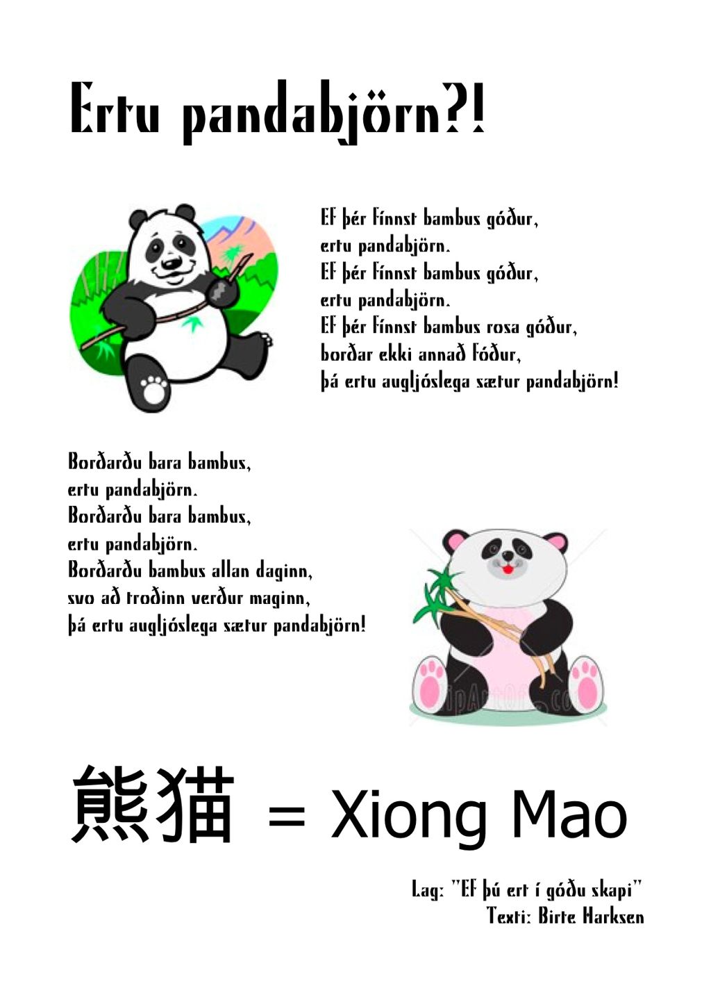 Pandabjörninn er þemadýr hjá okkur á Sjávarhóli, sem hefur vakið mikla lukku. Við höfum lært margt og mikið um þessi dýr, m.a. að þau heita Xiong Mao á kínversku, að þau jarma eins og kindur, og að þau borða næstum ekkert nema bambus og eru í útrýmingahættu. Af því það vantaði sérstök lög um pandabirni, gerðum við bara okkar eigin texta við þekktar laglínur. Þetta er eitt dæmi um það (laglína: If you're happy and you know it).