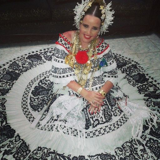 Estefany í þjóðbúningi sem kallast Pollera