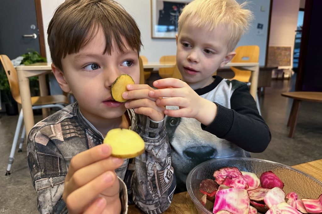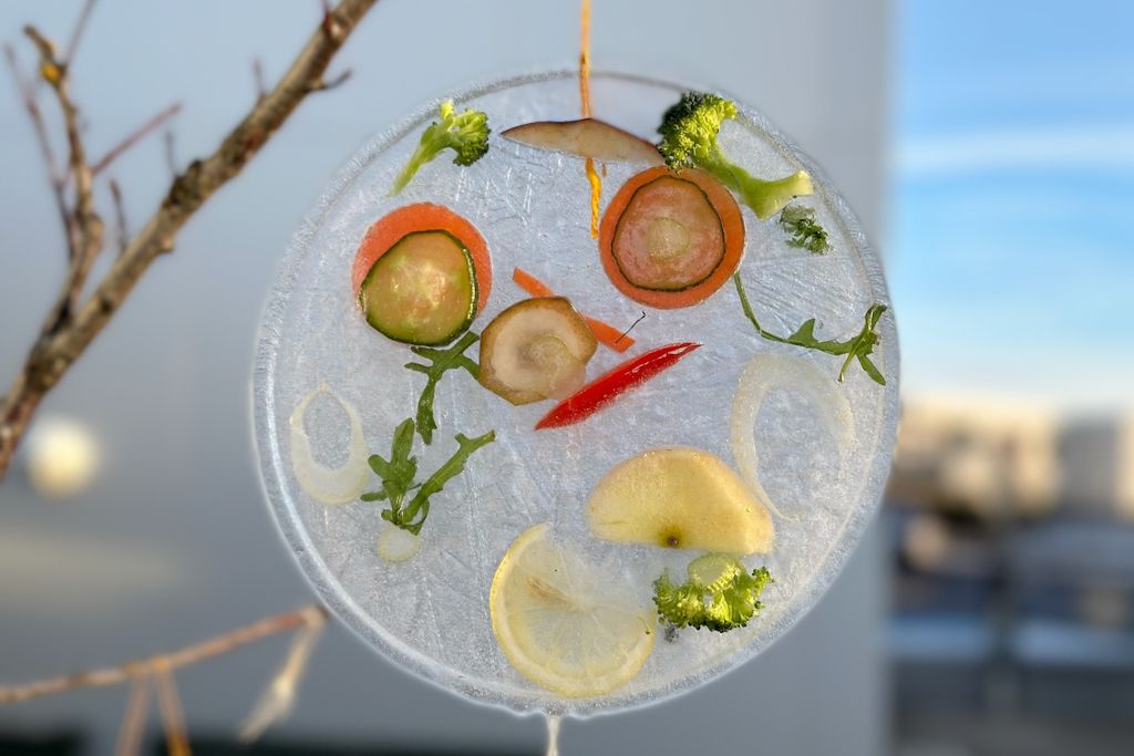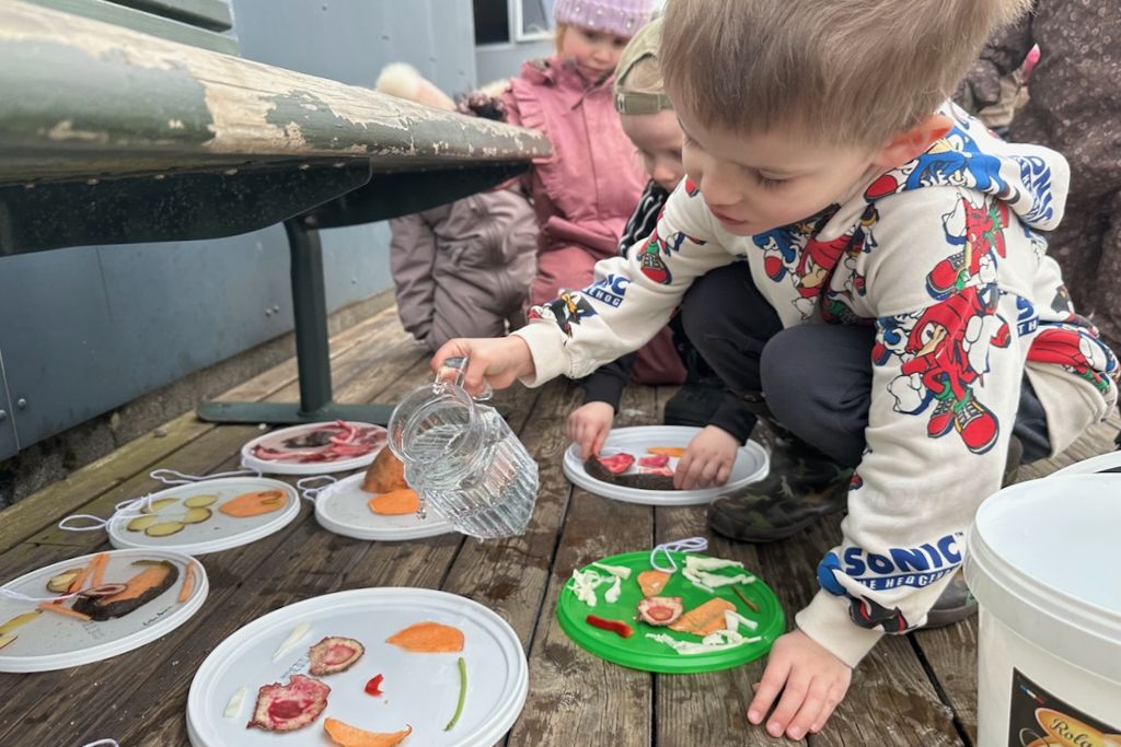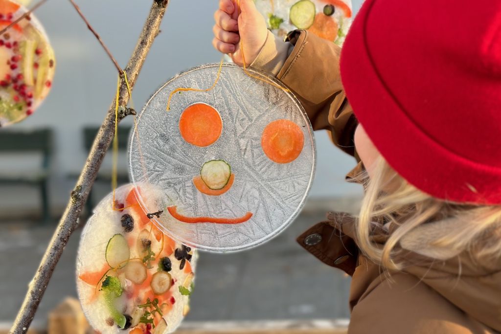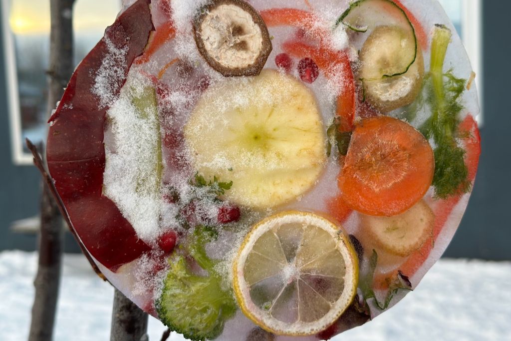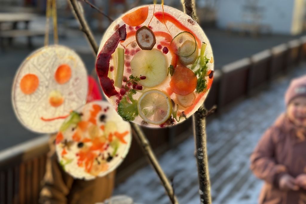 Árið 2024 byrjaði með mikilli kuldatíð og því var upplagt að nota frostið til að búa til íslistaverk þar sem við tengdum saman sköpun og vísindi. Börnin á Aðalþingi unnu saman tvö og tvö svo að samvinnan og samtalið væru í fyrirrúmi. Efniviðurinn var grænmeti og ávextir sem við fengum í eldhúsinu og við notuðum tækifærið til að skoða og rannsaka í leiðinni.