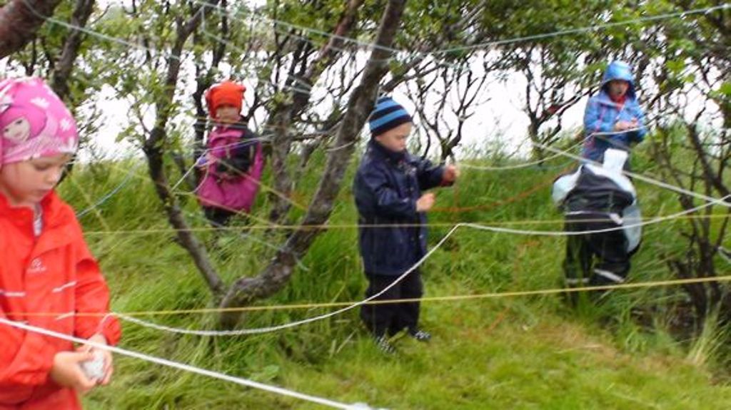 Það eru margir möguleikar í því að vinna með kóngulóarþema með börnunum. Börnin hér á myndinni hafa búið til risastóran kóngulóarvef úr garni sem þau svo léku sér í. Einn kennari á Urðarhóli þýddi enska lagið "The Crawling Spider" yfir á íslensku, þar sem aðalspennan er að öskra í lokin og hlaupa burt!