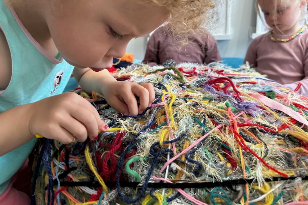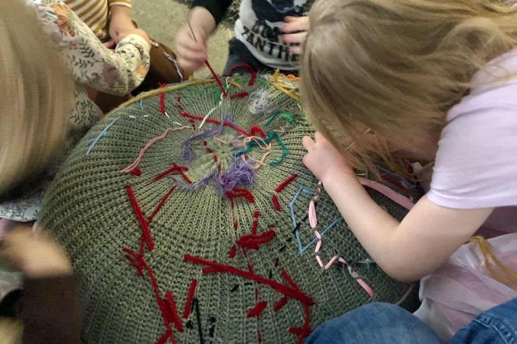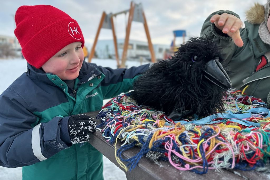 Handbrúðan gerði lukku í útivistinni einn daginn og tók sig vel út í skrautlega laupnum sem börnin höfðu saumað úr alls konar garni. Laupurinn var reyndar upphaflega töfrapúði en áklæðið passaði síðan fullkomlega í þetta hlutverk. Við tókum hátalara með okkur út og sungum og spiluðum mörg krummalög af Spotify.