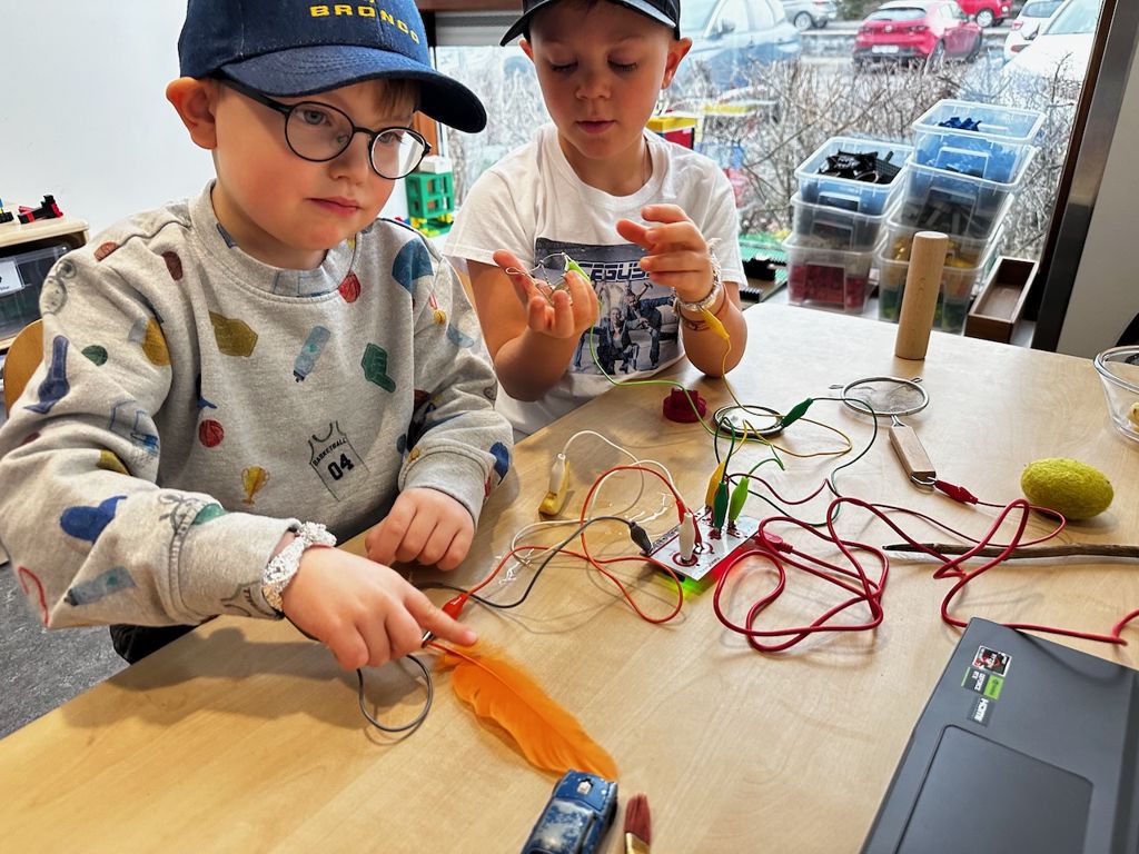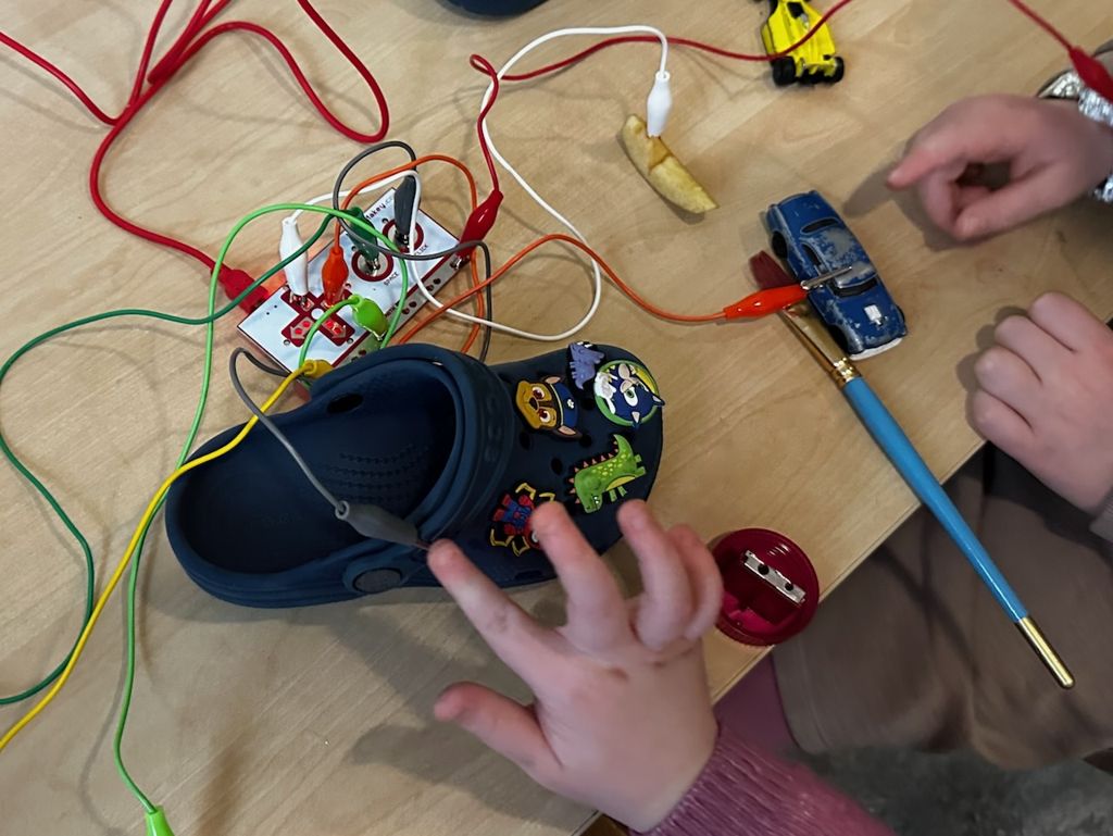 Hafþór setti stöðina upp þannig að börnin gætu fyrst sjálf rannsakað hvað hægt væri að nota sem rafleiðara og þannig mynda hljóð með tækinu þegar það er tengt við tölvu eða iPad (og gegnum þessa vefsíðu sem er á vefsvæði Makey Makey).