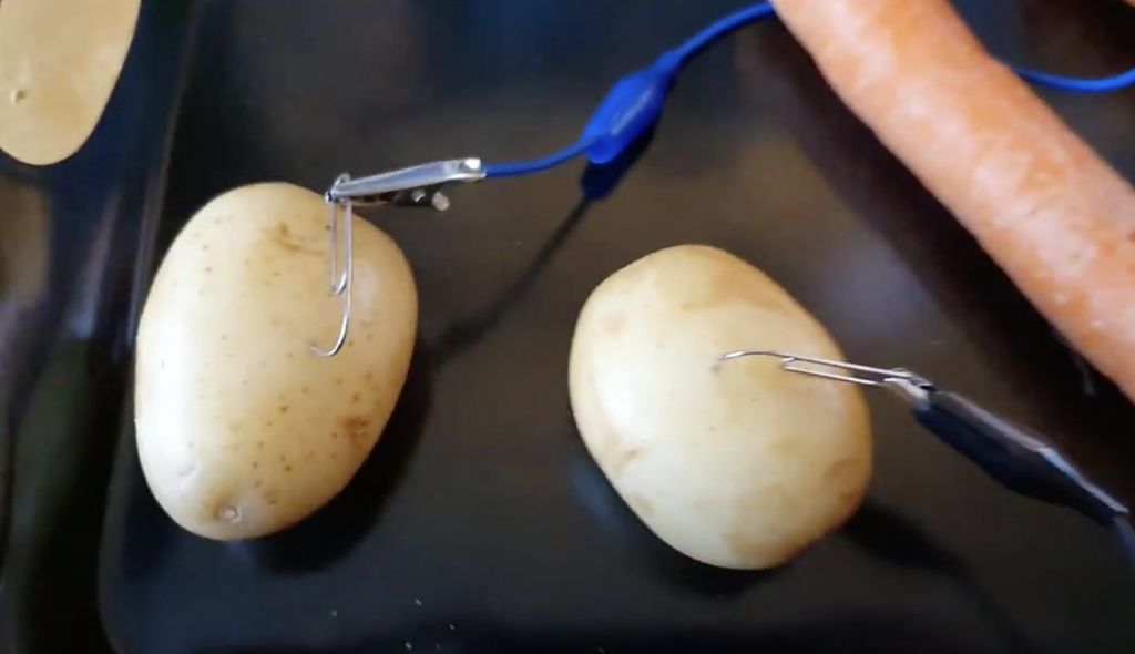 Ég komst að því undir lok verkefnisins að ég hefði getað komist hjá því að þurfa að þrífa ávaxtamauk af krókódílaklemmunum með því að nota bréfaklemmur sem millilið eins og sést á myndinni hér að neðan.