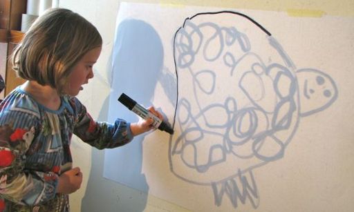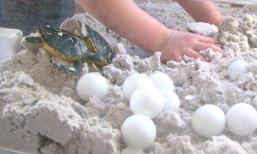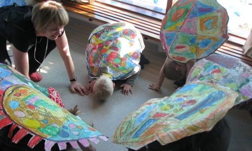 Þessa rólegu og indælu möntru sungum við á Sjávarhóli þegar við vorum með skjalbökuþema vorið 2011. Við gerðum einfaldar hreyfingar við sem sjá má á myndskeiðinu. Þar er einnig hægt að sjá svipmyndir úr neðansjávarleik þar sem stóru sæskjaldbökurnar synda í næði og ró. Börnin höfðu unnið lengra ferli með því að skreyta og mála stóru skjaldbökuskelina sína og útkoman var alveg meiri háttar. Þar sem sæskjaldbökur synda svo hægt og rólega virkaði vel að nota ljós- og skuggaleik og slökunartónlist með þemanu.
