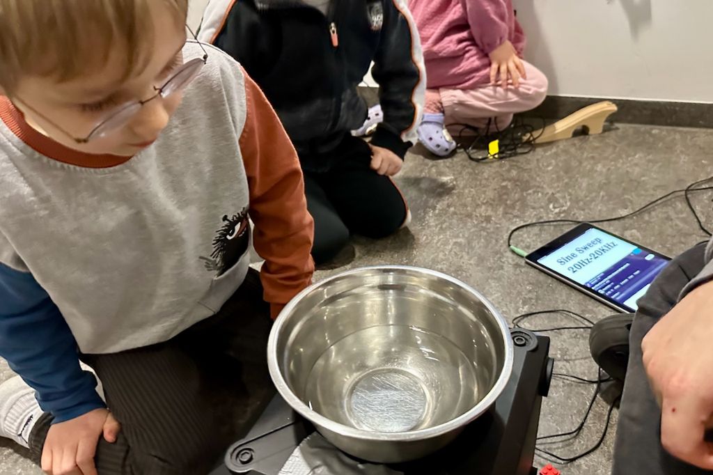 Ögmundur tengdi bassaboxið og hátalarana við iPad þar sem hann m.a. spilaði YouTube-myndskeið þar sem tíðninni var smátt og smátt breytt úr mjög djúpum (20 Hz) í mjög háan (20 kHz) tón. Tilraunin þeirra sýndi greinilega að við lága tóna var mikill titringur á bassaboxinu en að hann hætti alveg við háa tóna.