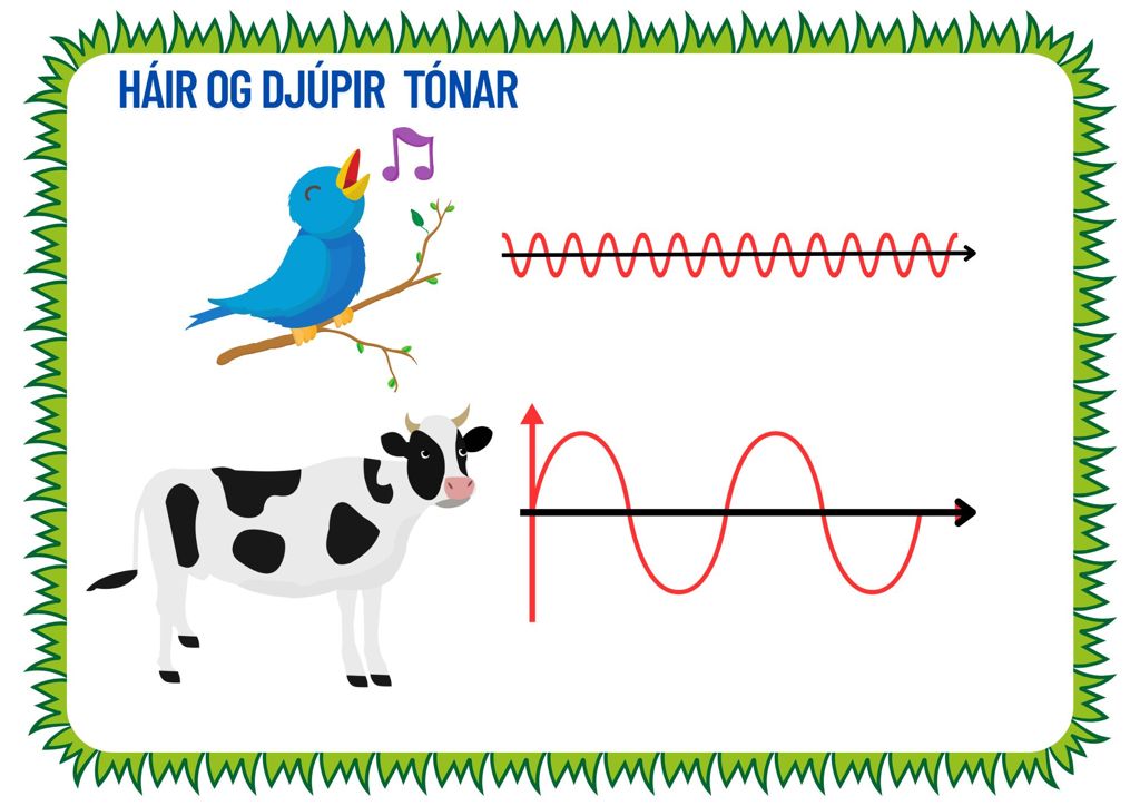 Eitt aðalatriðið sem kom fram í tilraunum Ögmundar og barnanna var munurinn á háum og djúpum tónum. Djúpu tónarnir fengu kubbana á bassaboxinu til að hristast en háu tónarnir ekki, og börnin gátu líka fundið titringinn sjálf með fingrunum. Það er vegna þess að þegar tíðnin er lægri er meiri orka í hverri hljóðbylgju (miðað við sama hljóðstyrk). Há hljóð hafa mikla tíðni og stutta bylgjulengd eins og fuglinn á myndinni hér að neðan á meðan djúp hljóð hafa litla tíðni og langa bylgjulengd eins og kýrin.