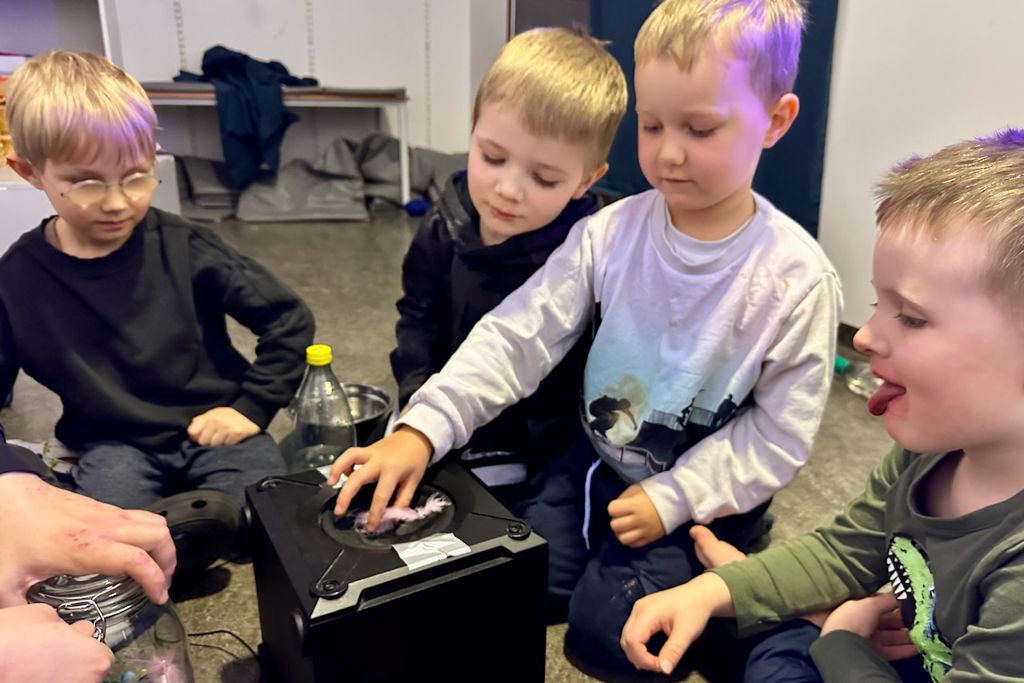 Hvernig er hægt að sjá hljóð? Samkennari minn, Ögmundur Jónsson, fékk skemmtilega hugmynd um að nota bassabox sem hann átti til að sýna börnunum á Hrafnaþingi það. Börnin gerðu ýmsar tilgátur um hvað væri að gerast og af hverju og Ögmundur sagði þeim svolítið frá hljóðbylgjum og hvernig þær virka.