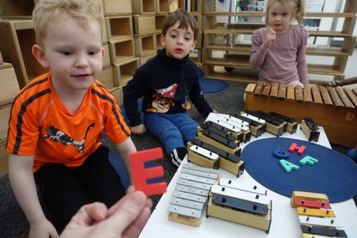 Næsta skref var að skoða hvaða stafir/tónar voru á hljóðfærunum. Við náðum í stóran kassa með bókstöfum úr plasti og drógum upp stafi af handahófi. Síðan gáðum við hvort sá stafur væri notaður í (C-dúr) tónstiganum, þ.e. C, D, E, F, G, A, B (stundum kallað H).
