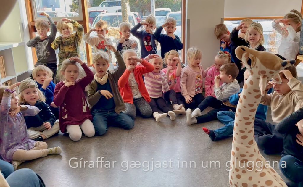 Eftir upptökurnar spjallaði ég við krakkana um það að gíraffar eru með langa, svarta tungu og tók fram símann til að sýna þeim mynd af því. Þetta leiddi til þess að við fundum líka dásamlegt myndskeið af fæðingu giraffaunga og börnin náðu í gíraffann okkar og vildu sýna honum hvernig það var þegar hann fæddist. Það fannst mér mjög krúttlegt :)